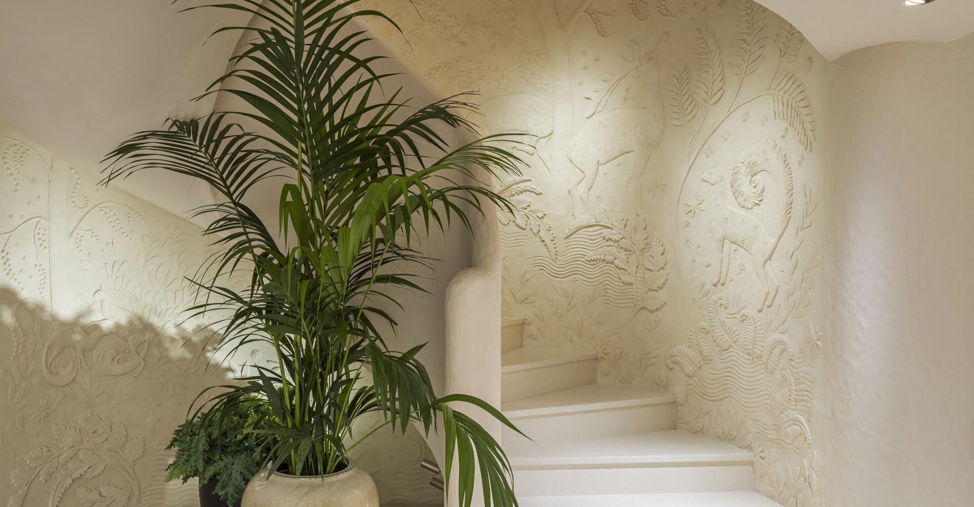 Decorated by a carved fresco inspired by Jeanne Lanvin’s bathroom designed by Armand Albert Rateau, it depicts a luxuriant and imaginary fauna and flora. Birds are a constant feature at Jeanne Lanvin and the daisy prints are another element of the graphical identity of Lanvin linked to her daughter Marguerite whose name means daisy.